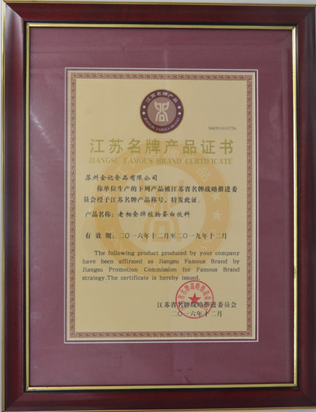 近日,江苏省名牌战略推进委员会公布了获得2016年江苏名牌的产品及企业名单,苏州金记食品有限公司老相食牌植物蛋白饮料荣获2016年"江苏名牌"称号。