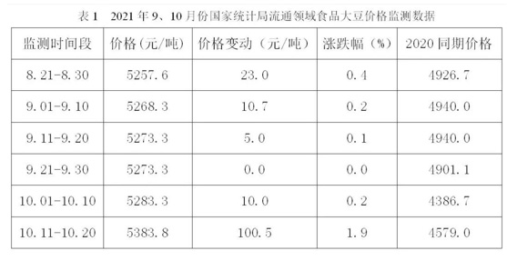 ▲表1 2021年9、10月份国家统计局流通领域食品大豆价格监测数据