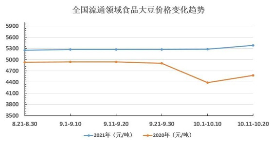 分析:受国际进口大豆格局趋于平稳、疫情影响造成的粮食安全担忧情绪减弱以及我国食品大豆政策方面的应对措施等影响,全国流通领域2021年9、10月份食品大豆价格呈现整体平稳小幅上扬的运行态势。